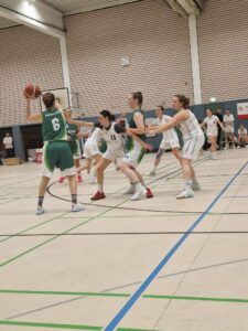 Das erste Viertel verlief absolut ausgeglichen. Keine der beiden Mannschaften schaffte es, sich entscheidend abzusetzen. Auch im zweiten Spielabschnitt setzte sich dieser Trend fort, wobei die Intensität in der Verteidigung auf beiden Seiten spürbar zunahm. Mit einem hauchdünnen Rückstand von 21:22 aus Sicht der „Haanerinnen“ ging es in die Kabine.